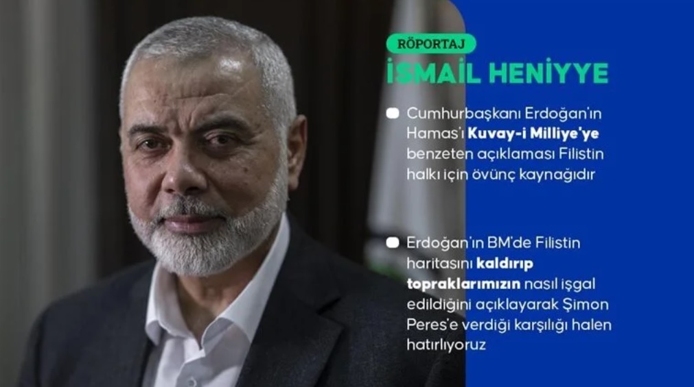 Hamas'ın Siyasi Büro Başkanı İsmail Heniyye, Cumhurbaşkanı Recep Tayyip Erdoğan’ın Filistin davasına verdiği destekten övgüyle bahsederek, ”Cumhurbaşkanı Erdoğan'ın, Adalet ve Kalkınma Partisi'nin parlamento bloku toplantısında yaptığı ve Hamas'ı 'Ulusal kurtuluş hareketi' olarak tanımlayan ve Kuvay-i Milliye'ye benzeten açıklaması şüphesiz ki, bizim ve Filistin halkı için övünç kaynağıdır." dedi.