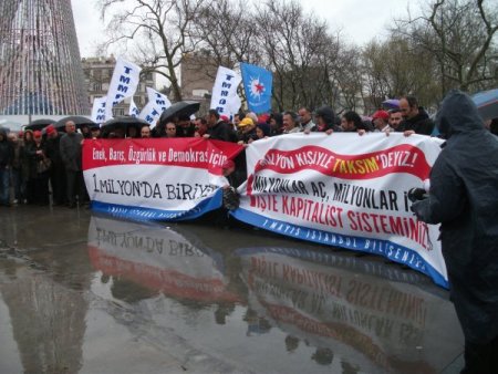 Taksim Gezi Parkı’nda toplanan grup, ‘Emek, Barış, Özgürlük ve Demokrasi için 1 Milyonda biriyim’, ‘1 Milyon kişiyle Taksim’deyiz. Milyonlar aç, milyonlar işsiz işte kapitalist sisteminiz’ yazılı pankartlar açtı. 1 Mayıs Bileşenleri adına hazırlanan ortak metni okuyan DİSK Genel Sekreteri Tayfun Görgülü, emek ve meslek örgütleri ve devrimci demokratik kurumlar olarak 1 Mayıs kutlamalarının hazırlıklarını sürdürdüklerini söyledi.