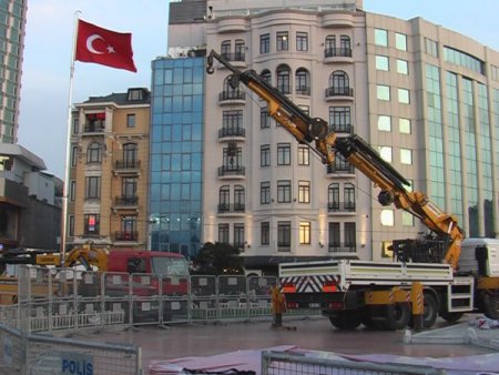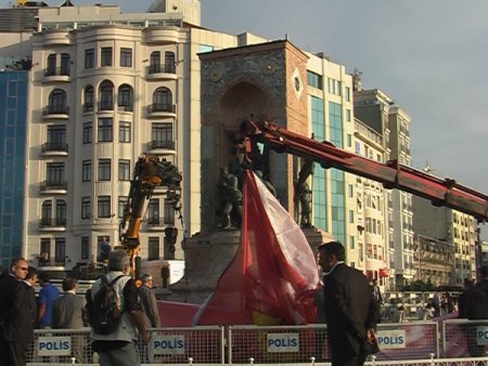 Taksim Meydanı’nda yarın yapılacak 1 Mayıs kutlamaları tüm hızıyla devam ediyor. DİSK’e bağlı ‘1 Mayıs Komitesi’, kutlamalar sebebiyle Atatürk anıtının bulunduğu noktaya 20 metre genişliğinde, 40 metre uzunluğunda üzerinde 1 Mayıs yazan afiş asmak istedi. Uzun süren uğraşlar sonucu 3 vinç kullanılarak asılmak istenen afiş kaldırıldığı sırada yırtıldı. Yırtılan afiş görevliler tarafından anıtın önüne indirildi. Dev afişin gece tamir edilerek yarınki kutlamalara yetiştirileceğini öğrenildi. CİHAN