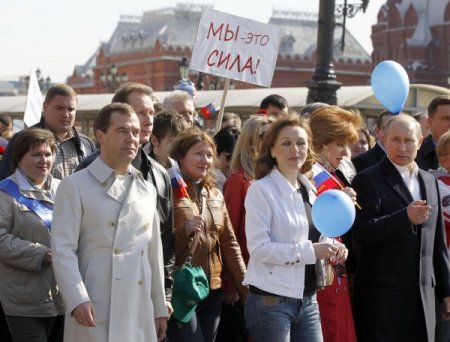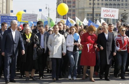 Rusya’da 1 Mayıs İşçi Bayramı yürüyüşüne Devlet Başkanı Dmitri Medvedev ve Başbakan Vladimir Putin de katıldı. 7 Mayıs’ta görev değişimine hazırlanan liderler, Rusya İşçi Birliği Federasyonu, iktidar partisi Birleşik Rusya ve Kremlin yanlısı gençlik grupları ile birlikte yürüdü.