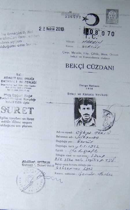Babasının yaklaşık 10 yıl devlete hizmet ettiğini, bu nedenden dolayı öldürüldüğüne dikkat çeken Cengiz Tekin, “Babamın koruculuk yaptığını bütün köy biliyor. Ancak, elimizde, üzerinde dönemin yetkililerinin imzası olan ve kendisine verilen Piyade Tüfeği vesikası ile korucu karnesi var. Fakat resmiyette hiçbir kaydının bulunmadığı ileri sürülüyor. Duyunca şaşırdık. Gösterdiğimiz vesikanın resmiyette bir hükmünün olmadığı belirtiliyor. Babamın koruculuk yaptığını ispatlamak için çalmadık kapı bırakmadık. İlgili yerlerle halen yazışmalar sürüyor.” dedi.