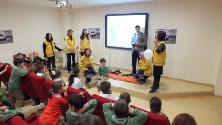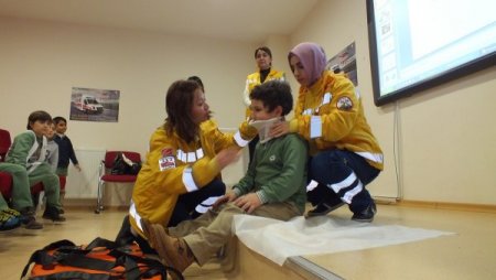 Ardından uygulamalı olarak okulda düşen bir öğrenciye yardım etmek için 112’yi arayıp, canlı olarak merkez ile iletişim kuran öğrenciler, akabinde gelen ambulansa hastanın nasıl taşındığı da gördü.