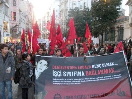 12 Eylül darbesinin hafızalarda yer edinen olaylarından Erdal Eren’in idam edilmesini protesto etmek isteyen İstanbul Emek Gençliği üyesi bir grup Galatasaray Meydanı’nda toplandı. Taksim’e doğru yürüyüşe geçen grup, ‘Gençlik gelecek gelecek sosyalizmde’ , ‘Emperyalistler işbirlikçiler 6. Filo’yu unutmayın’ , ’12 Eylül AKP’yle sürüyor’ , ‘Gün gelecek devran dönecek AKP halka hesap verecek’ , ‘İş eğitim barış istiyoruz’ şeklinde sloganlar attı.