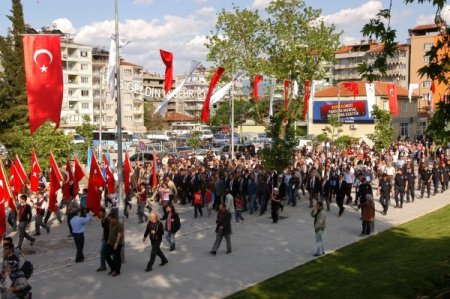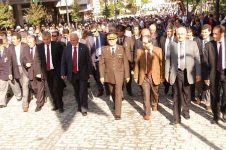 Valilik anıtına çelenk konulmasının ardından Vali Erkmen, Şeref Defterini imzaladı. Buradaki törenin ardından protokol üyeleri ve vatandaşlar Milli Mücadelenin başladığı Kayalık Caddesi'nden Bayramyeri Meydanı'na kadar yürüdü. Kortej eşliğinde yapılan yürüyüşe vatandaşlar da büyük destek verdi. Tören Bayramyeri Meydanı'nda devam etti.