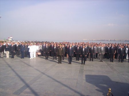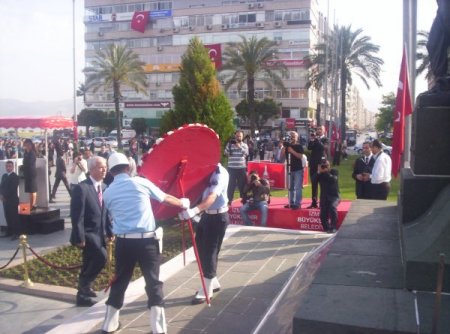 Kutlamalar, saat 08.30'da Cumhuriyet Meydanı'ndaki Atatürk anıtına çelenk koyulmasıyla başladı. Buradaki törende beyaz ve siyah renkli fötr şapka takan iki kişi, ilgiyi üzerlerinde topladı. Saygı duruşu ve İstiklâl Marşı'yla devam eden tören, anı defterinin imzalanmasıyla son buldu. Anı defterine, İzmir Vali Vekili Ardana Totuk imzaladı. Kayınbiraderi vefat eden Vali Mustafa Cahit Kıraç ise törene katılamadı.