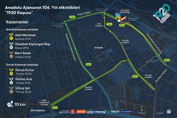 Genel klasmanda yarışan atletler, Anıtkabir çevresini kapsayan 10 kilometrelik parkuru, başlangıç noktası AA Genel Müdürlüğü'nde tamamladı.