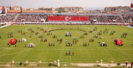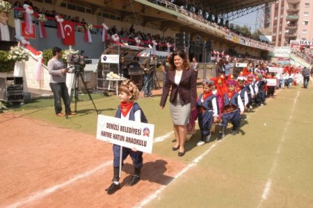 Kutlamalar, Atatürk Stadı'nda düzenlenen törenlerle devam etti. Vali Erkmen, Başkan Zolan ve Tugay Komutanı Özsoy, tören arabası ile statta bulunan öğrencilerin ve Denizlililerin bayramını kutladı. İl Milli Eğitim Müdürü Mahmut Oğuz’un günün anlam ve önemini belirten konuşmasının ardından ilköğretim okulu öğrencileri şiirler okudu. Törene katılan okullar, tören geçişinden sonra hazırladıkları gösterileri sundu. Gösteriler, stadı tamamen dolduran Denizlililerden bol bol alkış aldı. Bütün okulların gösterilerini sunmaları ile tören sona erdi. Vali Erkmen, tören sonunda sahaya inerek gösterilerin hazırlanmasında emeği geçen kutlama komitesini tek tek kutlayarak teşekkür etti.