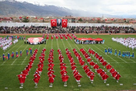 Törende öğrenciler tarafından 23 Nisan şiirleri okunmasının ardından, rengarenk kıyafetler içerisindeki yüzlerce öğrencinin katıldığı resmi geçit sonrası kız ve erkek gruplar, popüler müzik parçaları eşliğinde gösterilerini sundu.