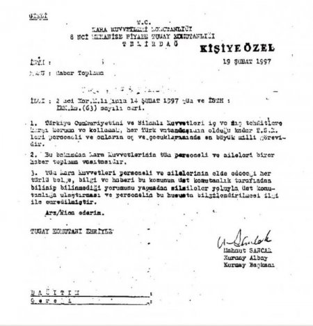 Kara Kuvvetleri Komutanlığı 8'inci Mekanize Piyade Tugay Komutanlığı'na ait 'kişiye özel' ve 'gizli' damgalı 19 Şubat 1997 tarihli belgede ise "Türkiye Cumhuriyetini ve Silahlı Kuvvetleri iç ve dış tehditlere karşı koruma ve kollama, her Türk vatandaşının olduğu kadar TSK'leri personeli ve onların eş ve çocuklarının da en büyük milli görevidir." deniyor.