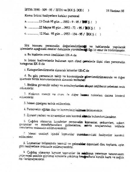 Post-modern darbe 28 Şubat sürecinde Genelkurmay'ın, birlikleri içinde 'istihbarat şebekesi' kurup 'irticai faaliyetler' kapsamında personelini takip ettirdiği ortaya çıktı. İsth. ve İKK. Ş. Md. tarafından 'İrticai Faaliyetlere Katılan Personel' başlıklı ve 19 Haziran 1995 tarihli emirde, irticai faaliyetlere katılan personelin takibi için birlik komutanlıklarının harekete geçmesi ve tedbirlerin alınması isteniyor.