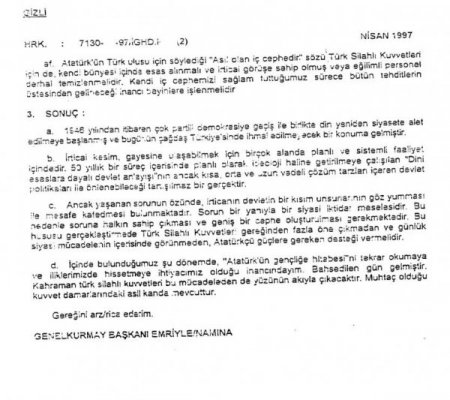 Genelkurmay Başkanlığı emriyle hazırlanan Nisan 1997 tarihli 'gizli' ibareli bir belgede ise askerlere Atatürk'ün Gençliğe Hitabesinin yeniden okunarak iliklerde hissedilmesi isteniyor. "Atatürk'ün Türk ulusu için söylediği 'Asıl olan iç cephedir' sözü Türk Silahlı Kuvvetleri için de kendi bünyesi içinde esas alınmalı ve irticai görüşe sahip olmuş veya eğilimli personel derhal temizlenmelidir. Kendi iç cephemizi sağlam tuttuğumuz sürece bütün tehditlerin üstesinden gelineceği inancı beyinlere işlenmelidir." denilen belgede, yaşanan sorunun özünde irticanın devletin bir kısım unsurlarının göz yumması ile mesafe katetmesinin bulunduğu ifade ediliyor. Sorunun bir yanıyla siyasi iktidar meselesi olduğunun savunulduğu belgede, Atatürkçü güçlere gereken desteğin verilmesi isteniyor.
