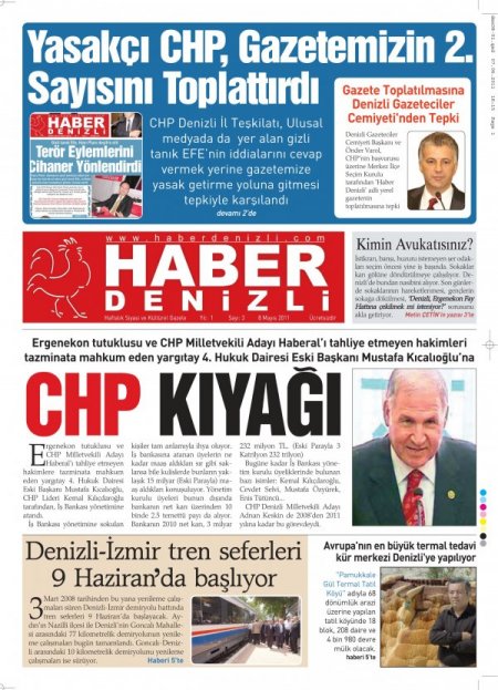 Denizli’de yayınlanan "Haber Denizli" isimli haftalık yerel gazete, CHP'nin başvurusu üzerine, Acıpayam İlçe Seçim Kurulu tarafından toplatıldı. CHP Acıpayam İlçe Başkanı Ömer Alev’in başvurusunu görüşen kurul, “Haber içeriklerinin yoğunlukla CHP aleyhine vatandaşın oyunu etkileyecek biçimde yayın yapılması sebebiyle herhangi bir surette dağıtımı yasaktır.” diyerek gazetenin toplatılmasına karar verdi. Karara, AK Partili üye İdris Cengiz muhalefet şerhi koydu.