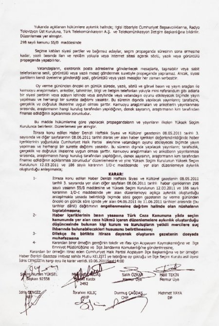 Haber Denizli ve "www.haberdenizli.com" İmtiyaz Sahibi Mutlu Kelişti, “CHP’li politikacılar açıklamalarında çok ağır ifadeler kullanırken ve bunlar gazetelerde yer alırken bir suç bulunmuyor. Bizimse Ergenekon tutuklusu Prof. Dr. Mehmet Haberal'ı tahliye etmeyen dokuz hakimi tazminata mahkum eden Yargıtay 4. Hukuk Dairesi eski Başkanı Mustafa Kıcalıoğlu’nun CHP kontenjanından İş Bankası Yönetim Kurulu üyeliğine getirildiğine dair haber yazmamız engelleniyor. Yüksek Seçim Kurulu (YSK)’nun ilgili kararını ben de inceledim. Burada, ‘Haberlerin tarafsızlık, gerçeklik ve doğruluk ilkelerine uygun olması şarttır.’ diyor. Şimdi Kıcalıoğlu’nun İş Bankası’nın yönetime atandığı yalan mıdır? Eğer bu haber CHP’nin aleyhine ise bu atamayı yapmasaydı. Buna dayanılarak böyle bir karar verilmesini, kamuoyunun vicdanına bırakıyorum.” şeklinde konuştu. CİHAN