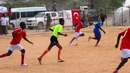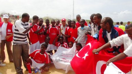 Somali’de silahların gölgesinde bir hayat devam ederken, bir taraftan açtığı çadırlarla halka yardım elini uzatan Türk Kızılayı, diğer taraftan halka moral verecek sosyal çalışmalar yürütüyor. Hiçbir stadyumun olmadığı Somali’de, kemiklerin atıldığı bir çöp alanını ıslah eden Kızılay, başkent Mogadişu’da çocukların top oynayabileceği bir futbol sahası açtı. Resmi açılışını Türk Kızılayı Başkanı Ahmet Lütfi Akar’ın yaptığı sahada, Vadajir bölgesindeki çadırlarda yaşayan çocuklarla Kızılay çadırlarında kalan çocuklar arasında dostluk maçı oynandı.