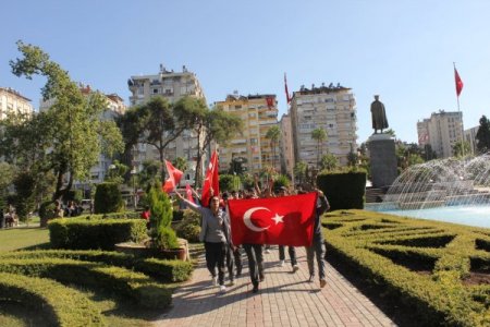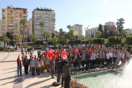 Yol boyu ellerindeki Türk bayrakları ile “Şehitler ölmez vatan bölünmez, Adana uyuma şehidine sahip çık, Ne mutlu Türküm diyene” şeklinde sloganlar atan öğrenciler, Atatürk Anıtında saygı duruşunda bulundu ve İstiklal Marşı okudu.