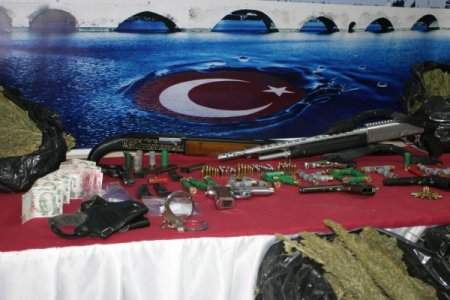 Gözaltına alınan kişilerin ev ve iş yerlerinde yapılan aramalarda 67 kilo 900 gram esrar, 2,3 gram eroin, 4 uyuşturucu nitelikli hap, 5 tabanca, 8 şarjör, 51 fişek, 38 adet kuru sıkı fişeği, 2 ruhsatsız av tüfeği, 2 seyyar dipçik ve 2 metal kelepçe ele geçirildi.