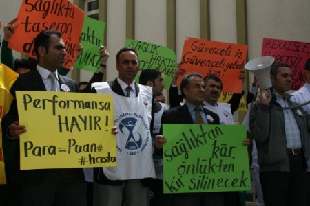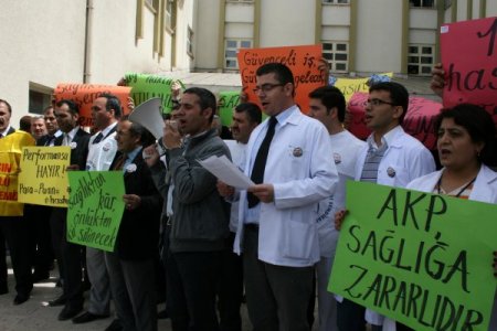 Ağrı Devlet Hastanesi'nin önünde bir araya gelen Ağrı Tabip Odası, SES Ağrı Şubesi ile Dev Sağlık- İş'e bağlı bir grup sağlık çalışanı ellerinde ''100. hasta olmak istemiyorum'', ''AKP, sağlığa zararlıdır'', ''Performansa hayır'', ''Sağlıktan kar, önlükten kir silinecek'', ''Hastaneler halkındır satılamaz.'' yazılı dövizler taşıdı.