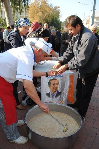 Antalya'nın Manavgat ilçesinde AK Partili kadınlar, Cumhuriyet Meydanı'nda 2 bin kase aşure dağıttı.