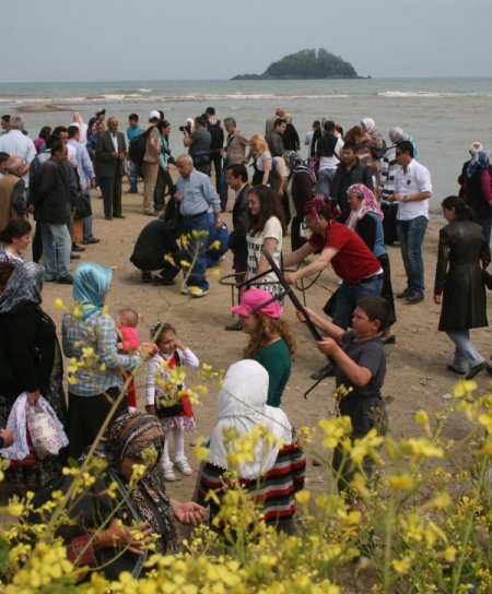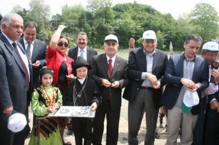 Sanatı Şevval Sam ise HES’lerin Karadeniz Bölgesi’nde yapımlarının durmasını diledi. Protokol üyeleri daha sonra Aksu Deresi’nin Karadeniz’e döküldüğü yere giderek burada dereye 7 çift, bir tek taş attı.