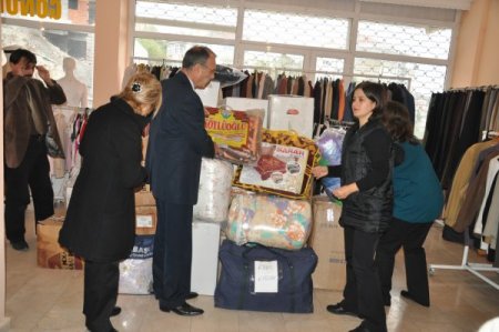 Alaplı Belediyesi Gönül Köprüsü Mağazası’nda toplanan yardımlar tasnif edilerek paketleniyor. Belediye görevlilerince yürütülen tasnif ve paketleme çalışmalarına, kampanyanın başlamasından bu yana çalışmalara destek veren Belediye Başkanı Nevzat Çimenoğlu’nun eşi Dilek Çimenoğlu da katılıyor.