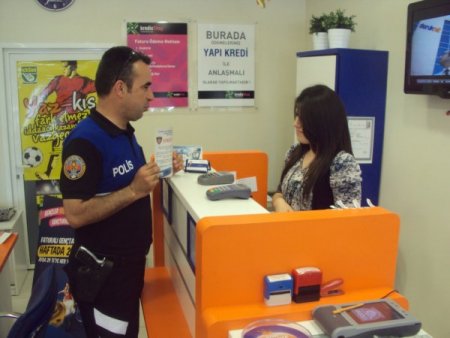 İzmir'in Aliağa ilçesindeki Toplum Destekli Büro Amirliği, ev ve işyerlerini tek tek dolaşıp vatandaşları dolandırıcılara karşı uyarıyor. "İlçene sahip çık. duyarsız kalma. 155'i ara" sloganıyla kampanya başlatan polisler, kontör ve ATM dolandırıcılarıyla hırsızlara karşı dikkatli olmaya çağırıyor. ATM'lere, kontör satış yerlerine, işyerlerine ve apartman girişlerine bununla ilgili afişler yapıştırılıyor.