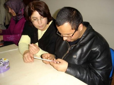 Seyfi Demirsoy Kadınlar Eğitim ve Kültür Merkezi’nde, Trabzon hasırı örme dersi veren Halk Eğitim Müdürlüğü öğretmenlerinden Sevinç Kök’ün dersine giren engelliler, kadınlarla birlikte hasır örmeyi de öğrendi.
