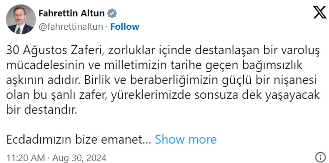 Cumhurbaşkanlığı İletişim Başkanı Fahrettin Altun, sosyal medya hesabından 30 Ağustos Zafer Bayramı'nın 102. yıl dönümü dolayısıyla mesaj yayımladı.