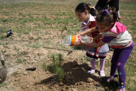 Okul Müdürleri Nuriye Asan’ın gözetiminde fidan dikimine gelen öğrenciler daha sonra fidanlarına can suyu verdi ve hep birlikte orman şarkısını söylediler.