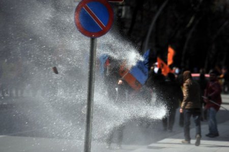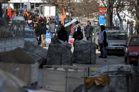Barikatı aşmaya çalışan gruba polis tazyikli su ve biber gazıyla müdahale etti. İlk müdahale sırasında BDP milletvekilleri Ertuğrul Kürkçü ve Sabahat Tuncel müdahalenin ortasında kaldı. Korumalar vekillerin üzerine siper olarak, taş ve şişelerden korumaya çalıştı. Vekiller, eylemcilerin de yardımıyla buradan güçlükle ayrıldı. Bu sırada atılan bir taş KESK Genel Sekreteri İsmail Hakkı Tombul’a isabet etti.