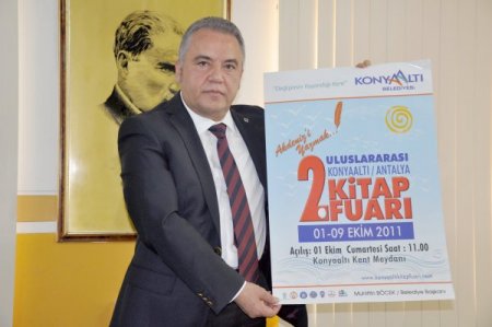 Konyaaltı Belediyesi tarafından 01-09 Ekim tarihleri arasında bu yıl ikincisi düzenlenecek olan Uluslararası Konyaaltı Antalya Kitap Fuarı’yla ilgili Belediye Başkanı Muhittin Böcek basın toplantısı düzenledi. Konyaaltı Kent Meydanı’nda gerçekleştirilecek kitap fuarında her biri bin metre kare olan 3 ayrı çadır kurularak, yazarlarla halkın buluşması sağlanacak. 2010 yılında düzenlenen kitap fuarının açılışında gerçekleştirilecek bu programın uluslararası alanda olmasını hedeflediklerini ifade eden Muhittin Böcek, bu yılki fuara 16 ülkeden kültür ataşesinin geleceğini söyledi.