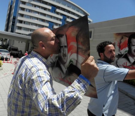 Antalya'ya gelen Beşar Esad taraftarlarının Esad'ın fotoğraflarını öptüler CİHAN...