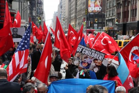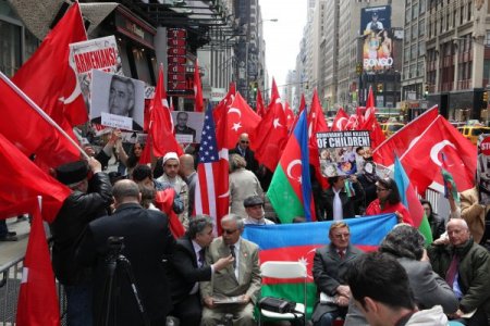 Bugün Times Meydanı’nda, New York Polis Teşkilatı'nın (NYPD) aldığı güvenlik çemberi içinde bir araya gelen çok sayıda Türk vatandaşı ermeni yalanlarına hayır dedi. Türk, Azerbayan ve Amerikan bayraklarının açıldığı gösteriye bazı aileler çocukları ile birlikte gelerek mitinge destek verdi. Gösteride, ASALA Ermeni terör örgütü tarafından katledilen Türk diplomatların resimleri taşındı. Protesto'ya katılanlar arasında çok sayıda Azeri vatandaşların katılması dikkat çekti. Amerikan marşı ve İstiklal Marşı'nın okunmasının ardından konuşmalarla devam eden mitingte, Türk gençleri sözde ermeni soykırım iddialarının asılsız olduğunu anlatan broşürler dağıttı.