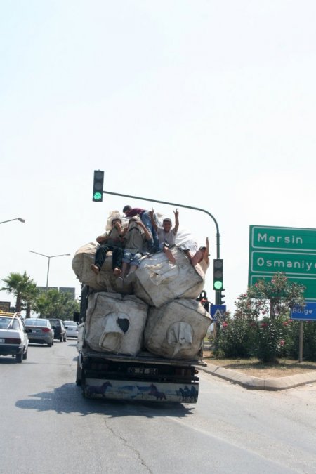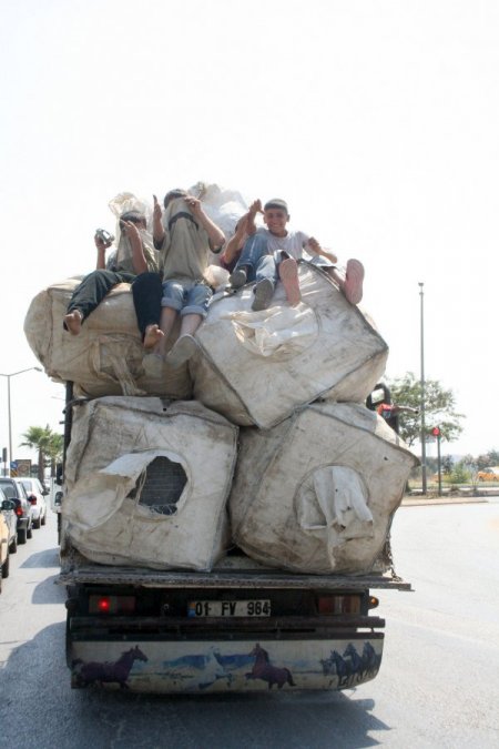 Adana’nın merkez Seyhan ilçesinde topladıkları atıkları bir pikaba yükleyen çocukların, yükün üzerinde tehlikeli yolculuğu görenleri şaşırttı. Trafikte seyreden pikabın üzerindeki çocuklar hallerinden oldukça memnun gibi görünse de hem kendi hayatlarını tehlikeye attı, hem de trafikteki diğer araçlarda bulanan vatandaşları.