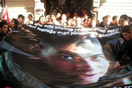 Şehit Çolakoğlu'nun Türk Bayraklarıyla donatılmış evinin önünde bekleyen kalabalık, evin önünü adeta miting alanına çevirdi. Şehit Çolakoğlu resminin bulunduğu dev bir afiş de hazırlayan vatandaşlar, terör örgütü aleyhine sloganlar attı.
