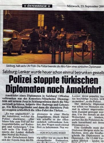 Türkiye karşıtlığının en üst düzeyde olduğu Avrupa ülkelerinden biri olan Avusturya'da yabancılar ve özellikle Türkler hakkında çıkan olumsuz haberlere bir yenisi daha eklendi. Sekiz milyonluk ülkede bir milyona yakın tirajı olan Krone gazetesi, dün sabaha karşı Salzburg'da alkollü araç kullanırken yapılan bir ihbar üzerine polis tarafından durdurulan Türk diplomat ile ilgili haberi 1.sayfadan okurlarına duyurdu.