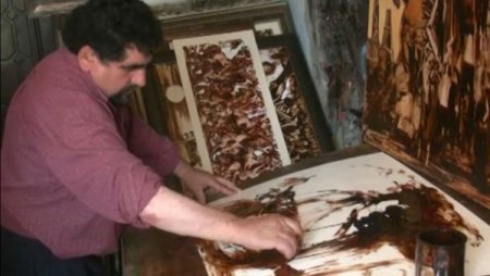 Azeri ressam petrolle ilk çizdiği resimleri bugün gibi hatırladığını belirterek, "Bayıl kasabasındaki petrol dolu gölü görünce bir cam şişeye doldurup resim atölyesine getirdim. Ve denemeye başladım" diyor.