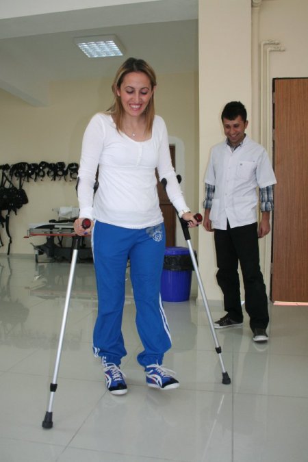 Fizik Tedavi Uzmanı Dr. İsmet As ise uzun yürüme cihazı ile adım atmaya, daha sonra koltuk değneği ile yürümeye başlayan Mehtap Bakır’ın, bundan sonraki dönemde koltuk değneklerini de bırakacağını söyledi.