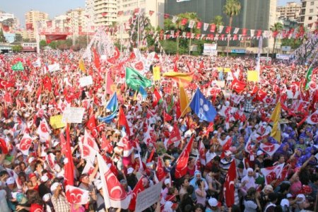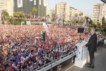 "Bu zihniyetten kurtulmanın tam zamanıdır. Bu zatın aşırı kibirlenmesinin karşılığı mutlaka verilmedir. Milleti kandırmasının bedeli kesinlikle ödenmelidir. Çünkü 9 yıla yaklaşan iktidarının talihsizliğine bizzat sizler şahitlik ettiniz. Onun çıraklık ve kalfalık dönemindeki talihsizliğe sizler şahitlik ettiniz. Başbakanın gafletle geçen çıraklık dönemi ve dalaletle geçen kalfalık döneminin ardından ustalık dönemi istiyor. Bu dönem karanlık bir dönemdir. Vurguncunun yağmacının hanedan mensuplarının yeni bir dört yıl daha bu ülkeyi karanlığa götürmesine izin vermeyin. Bu iktidar menfaat çeteleriyle kol kola girerek yarım kalan işlerini tamamlamaya çalışmaktadır. Türkiye bu iktidardan kurtulmazsa uçurumun dibini boylayacaktır. AK Parti yokuş aşağı giden freni patlamış bir kamyon gibi kontrolünü ve yönünü kaybetmiştir. Habur’da eli kanlı teröristleri davulla karşılamak hayaldi AK Parti sayesinde gerçek oldu. PKK açılımıyla Türkiye’nin yıkım sürecine girmesi hayaldi AK Parti ile gerçek oldu. PKK’lı teröristleri serbest bırakmak hayaldi AK Parti ile gerçek oldu. 'Şehitler ölmez vatan bölünmez' sözünü tahrik unsuru saymak hayaldi AK Parti ile gerçek olmuştur. Türklüğe hakaret hayaldi AK Parti ile gerçek olmuştur. Şehidimize kelle demek hayaldi bu da gerçek oldu. Cezaevindeki bir teröristin Türk milletine hakaret etmesi hayaldi bu da AK Parti ile gerçek olmuştur. Biz bu görüşmeleri deşifre ettiğimizde Başbakan deliye dönmüştü. Suçüstü yakalanmıştı. Bizi şerefsizlikle suçlamıştı. Ne var ki izlenen süreç kimin yakasına asıldığını göstermişti. İmralı kıyılarında su alan AK Parti teknesini açıkça göstermişti. İmralı’daki görüşmeleri kabul etmiş, Türk milletinin itibarını ayaklar altına alındığını göstermişti. Başbakan Erdoğan bizimle şeref rekabetine giremez. İzmir’de sormuştum, 'İktidara gelirsen İmralı canisini bırakacak mısın?' dedim. Başbakan Erdoğan sorulara soruyla cevap vermişti. Vakti geldiğinde ben gerekli açıklamayı yaparım demişti. Şimdi kıvırma. 12 Haziran sonrasında iktidara gelirsen terörist başını serbest bırakacak süreci başlatacak mısın? Böyle bir vaatte bulundun mu?. Böyle bir söz verdin mi. Bizimle haya tartışmalarına girme her girdiğinde sen kaybediyorsun. Ar damarın çatlamadıysa titre ve kendine gel. Şuursuzca konuşma. Milletimizi bilgilendir açıkca teminat ver. Yarın gerçekler ortaya çıkarsa senin için iyi olmaz. Şunu da unutma bunun hesabını senden ve yandaşlarından sorarım.” CİHAN