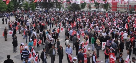 Bahçeli, Düzce'de partisinin seçim mitinginde konuştu. 12 haziran seçimlerinin kavşağa sürüklenmiş Türkiye için karar anı ve dönüm noktası olduğunu ifade eden Bahçeli, Başbakan Recep Tayyip Erdoğan'ı eleştirdi. Erdoğan'ın CHP'nin Hakkari mitingi ile ilgili eleştirilerine değindiği konuşmasında, "Sayın Başbakan terörle mücadelede üstün başarı sağlayacağı yerde partileri suçluyor. ‘Senin mitinginde şunlar vardı’ diyor. Peki seninkinde kim vardı? Bunların üzerinde hiç durmuyorsun. Terörün kökünü kazımak gibi bir gayretin içine girmiyorsun, demokratik açılım zırvası ile memleketi etnik kökenli bölünmeye doğru götürüyorsun. Bunlarla ilgili de 12 Haziran öncesi Anayasa değişikliği yapacağını, ileri demokrasi, özgürlük kavramlarını öne çıkartarak yine vatandaşı aldatarak, kandırarak seçimlerden sonuç almaya çalışıyorsun. Bu böyle devam etmemeli, devam edemez. Hangi partiden olursak olalım hepimiz bu ülkede yaşıyoruz. Yanlış yönetimler sadece muhalefet oyu kullanmış vatandaşları ezmiyor, iktidarın üst kademedeki yakınları, yalakaları, hanedanlarının dışında o partiye oy verip de hala işsiz ve yoksul kalan vatandaşlarımızı da eziyor. Öyleyse bu iktidarın üçüncü döneminin olmaması lazım." değerlendirmesini yaptı.