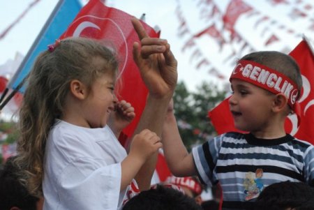 AK Parti’nin Türkiye’yi çok tehlikeli bir uçurumun kenarına getirdiğini savunan Bahçeli, "Milli devlet, üniter yapı, toprak bütünlüğü ve bin yıllık kardeşliğimiz sorgulanır tartışılır hale gelmiştir. AKP'nin hele hele son günlerdeki gizli gündemini çok iyi bilmek lazım. Hepimiz bu ülkenin evlatlarıyız. Değişik partilere mensup olabiliriz. Partiler de demokrasimizin renkleridir. Hepsine saygı duyarız. Ama Türkiye varsa hepsinin bir anlamı var. Yoksa Türkiye’yi unutup milleti tehlikeye attıktan sonra hiç birinin anlamı yoktur. Gün gelir önce ülkem ve milletim, sonra partim, sonra ben demem lazımdır. Ama AKP ülkeyi unutmuş, milleti yok farzediyor. Recep Tayyip Erdoğan’ın partisi bir baskı otoritesi haline gelmiştir. Sabah kalkıyor ‘Ben’ diyor, akşam yatıyor ‘Ben’ diyor. Ama şu an için çılgın projelerle milleti oyalıyor. Milleti tekrar aldatma yollarını arıyor. Ama Türkiye'nin gerçeklerini milletimizin huzuruna çıkıp tartışma gereği hissetmiyor. Yapılan mitinglerde hep uzaktan vatandaşın arasına girmeden havayoluyla devletin kaynaklarını kullanarak bu seçim propagandasını yürütüyor. AKP devleti iliğine kadar sömürüyor. Seçim döneminde de demokrasi içerisinde haksız bir rekabetle bir yarış başlatmıştır. Gece-gündüz bu millet Erdoğan’ı televizyonlarda görmeye, dinlemeye mahkum bırakılmıştır. Millet usanmış, bıkmıştır. Sabah 06.30’da Recep Tayyip Erdogan, gece 24'e kadar bu devam ediyor. Her televizyonda besleme bazı aydın ve köşe yazarlarıyla sözleşmeli ‘Al gülüm, ver gülüm’ yaparak önceden hazırlanmış sorularla Erdoğan’ı tekrar tekrar milletimize dinlemeye mecbur bırakıyor." diye konuştu.