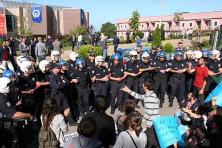 Grup, üniversite içerisine doğru giderken arkalarından gelen polis otobüsünün camını kırdı. Bu sırada polisler, güvenlik görevlileri ve grup arasında kısa süreli arbede yaşandı. Grup daha sonra olay yerinden uzaklaştı.