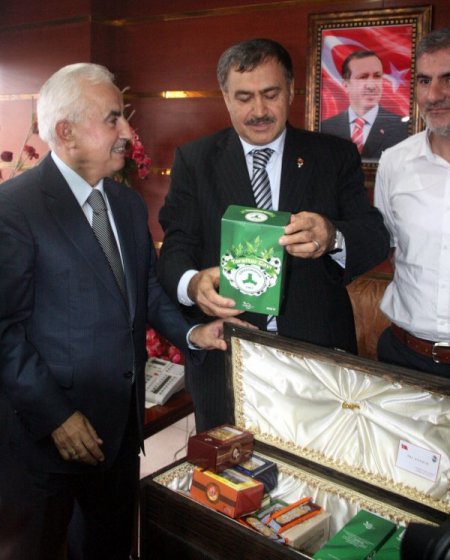Vali Şahin, Bakan Eroğlu'na, altın fındık rozeti ile Giresun ürünlerinin yer aldığı sandık hediye etti.