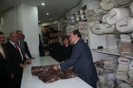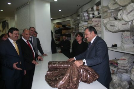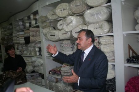 Eroğlu, dahasonra Nevşehir Valisi Abdurrahman Savaş, Milletvekili Mahmut Dede ve Belediye Başkanı Hasan Ünver ile birlikte esnaf ziyaretlerinde bulundu. AK Parti İl Başkanlığı binasının bulunduğu Atatürk Caddesi'nde vatandaşları selamlayan Bakan Eroğlu, Mustafa Çatlı isimli esnafın mefruşat mağazasına girdi. Mağazada doğruca perde satılan tezgahın başına giden Bakan Eroğlu, kendisinin de tezgahtarlık yaptığını söyleyerek eline aldığı perde topunu ustalıkla açtı. Tezgahtarlığın zor bir meslek olduğunu ve kendisinin de babasının iş yerinde çocuk yaşlarda tezgahtarlık yapmaya başladığını ifade eden Bakan Eroğlu, "Hem okula giderdim hem de boş zamanlarda iş yerimizde tezgahtarlık yapardım. Babam bana sürekli 'Oğlum kefen alacak müşteri gözyaşından belli olur' derdi. Bense her gelen müşteriye bir şeyler satmaya çalışırdım. Babam gelen müşterilerden bazıları için göz işareti ile 'almaz' demeye çalışsa da ben tüm kumaşları açarak satma çabası verirdim. Dolayısıyla iyi bir tezgahtardım." diye anlattı.