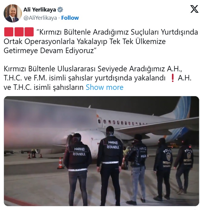 BAKAN ALİ Yerlikaya, sosyal medya hesabından yaptığı paylaşımda, kırmızı bültenle aranan suçluları yurt dışında ortak operasyonlarla yakalayarak tek tek ülkeye getirmeye devam ettiklerini belirtti.