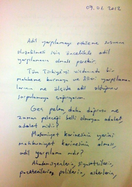 Adil yargılamayı etkileme suçunun oluşabilmesi için öncelikle adil yargılamanın olması gerektiğini iddia eden Balbay, "Tüm Türkiye'yi vicdanın da bir mahkeme kurmaya ve Silivri yargılamalarının ne ölçüde adil olduğunu sorgulamaya çalışıyorum. Geç gelen, daha doğrusu ne zaman geleceği belli olmayan adalet, adalet midir? Masumiyet karinesinin yerini mahkumiyet karinesinin alması, adil yargılama mıdır? Akademisyenlerin, siyasetçilerin, gazetecilerin, polislerin askerlerin, avukatların faaliyetlerinden ''Terör suçu'' üretip kimi yayın organları aracılığıyla ''yargılama sürerken terörist'' ilan etmek adil yargılama mıdır." ifadesini kullandı.