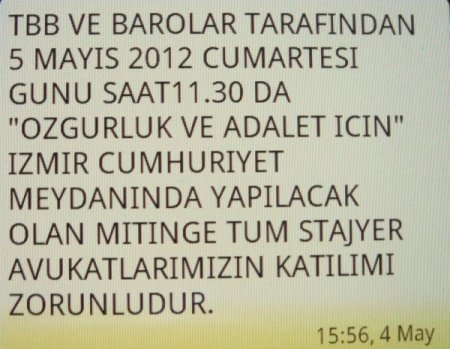 Türkiye Barolar Birliği (TBB) ve barolar tarafından 5 Mayıs'ta İzmir’de düzenlenecek 'Özgürlük ve Adalet İçin' mitingine Aydın Barosu stajyer avukatlara katılma zorunluluğu getirdi. Aydın’daki 40 stajyer avukata gönderilen mesajda 'TBB ve barolar tarafından 5 Mayıs Cumartesi günü saat 11.30’da 'Özgürlük ve Adalet İçin' İzmir Cumhuriyet Meydanı’nda yapılacak mitinge tüm stajyer avukatlarımızın katılımı zorunludur' denildi.