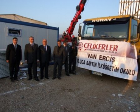 Depreminin vurduğu Erciş ilçesinin Kozluca köyüne kurulacak okulun yapı malzemeleri, altyapının tamamlanmasının ardından Vali İsa Küçük, İl Özel İdare Genel Sekreteri İbrahim Kayış, Çelikerler Konstrüksiyon Genel Müdürü Ramazan Çeliker, basın mensupları ve fabrika çalışanlarının da katıldığı törenle montaj için Van’a gönderildi.
