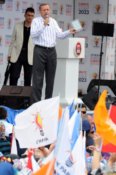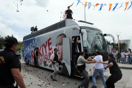 başbakan recep tayyip erdoğan partisinin seçim çalışmaları kapsamında erzurum istasyon meydanında düzenlediği mitinge katıldı. Başbakanın otobüsünün önüne geçmeye çalışan bir vatandaş korumalar tarafından durduruldu. CİHAN
