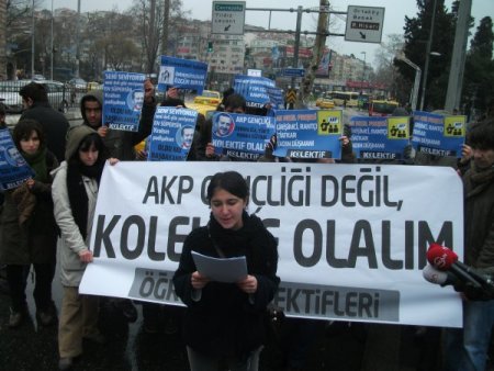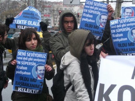 Öğrenci Kolektifleri üyesi yaklaşık 50 kişilik öğrenci grubu, Başbakan’ın gençlikle ilgili yaptığı açıklamaları protesto etmek için Beşiktaş Meydanı’nda toplandı. Başbakanlık çalıma ofisine doğru yürüyüşe geçen öğrencilerin önü ofise 200 metre kala çevik kuvvet ekiplerince kesildi. Bir süre polisle öğrenciler arasında geçen görüşmenin ardından öğrenciler yol kenarında basın açıklaması yapmaya karar verdi. ‘AKP gençliği değil kolektif olalım’ yazılı pankart açan grup, ‘Seni seviyoruz. Seni deli gibi seviyoruz. En süpersin, kralsın, padişahsın. Oldu mu Başbakanım?’ , ‘AKP gençliği değil zorbalığa, YÖK’e, paralı eğitime karşı kolektif olalım’ yazılı dövizler taşıdı.