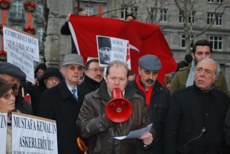 Türk bayrakları ve Atatürk posterlerinin yanı sıra “Aydınlık Gazetesi’nin” de taşındığı gösteride üzerlerinde, “Cumhuriyet değil, AKP yıkılacak”, “Mustafa Kemal’in askerleriyiz” ve “Silivri ve Hasdal tutsaklarına özgürlük” yazan pankartlar taşındı.